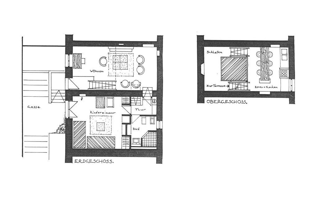 Über einen Zwischenflur erreicht man im Erdgeschoß das Bad und Kinderzimmer. Für 4 Pers., ca. 75 qm.